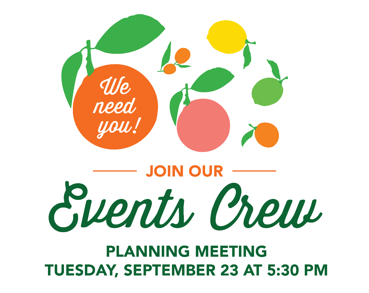 Many of you have been instrumental in planning and pulling off the amazing events we've put on over the years, and we need you to jump in and join our new Events Crew. It'll be a blast. And, together, we'll get this season of Orchard events going and growing. Join us for our first meeting!